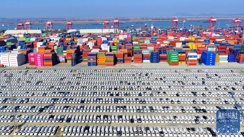 ↑ 12月14日在江蘇省港口集團(tuán)南京港龍?zhí)都b箱碼頭拍攝的等待裝船出口的國產(chǎn)汽車(無人機(jī)照片)。新華社發(fā)(楊素平攝)