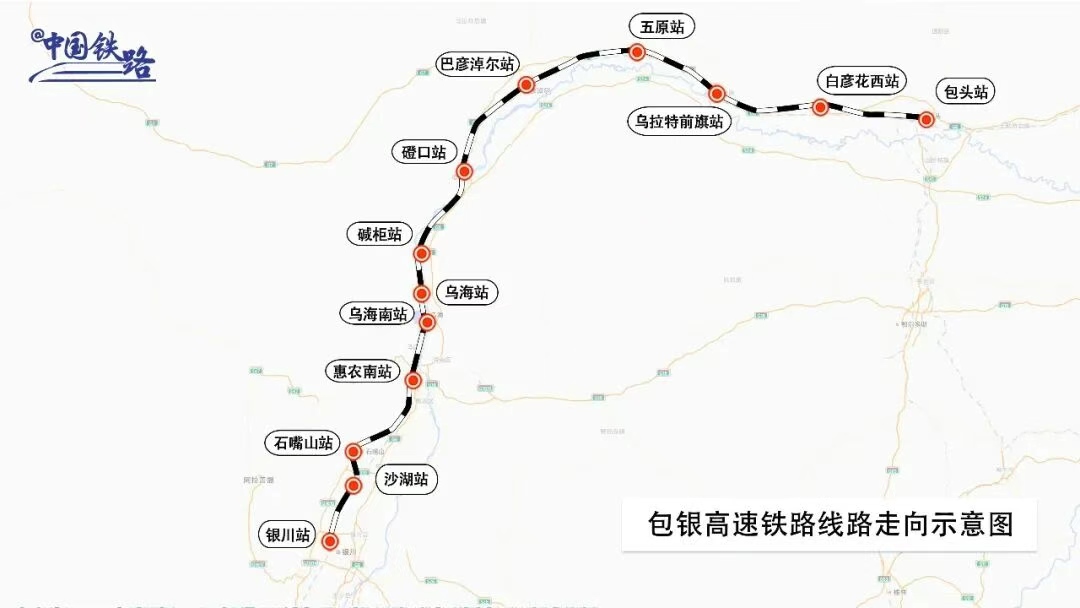 包銀高鐵起自包頭站,經(jīng)內(nèi)蒙古自治區(qū)包頭市、巴彥淖爾市、鄂爾多斯市、烏海市,寧夏回族自治區(qū)石嘴山市、銀川市,接入銀川站,正線全長519公里,設(shè)計(jì)時(shí)速250公里,實(shí)行分段建設(shè),其中,惠農(nóng)至銀川段全長97公里,已于2024年10月開通運(yùn)營,此次開通的包頭至惠農(nóng)段全長422公里,共設(shè)10座車站。