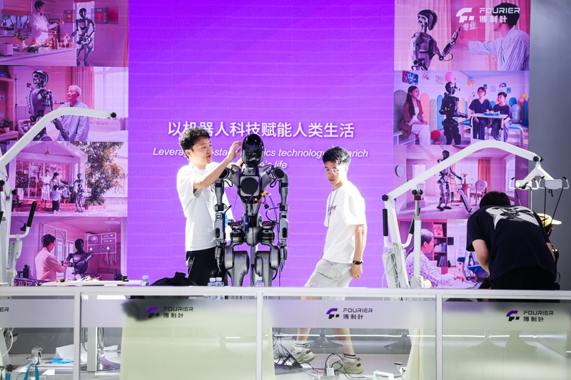 2025世界人工智能大會上,傅利葉工程師調試人形機器人。解放日報記者 海沙爾 攝