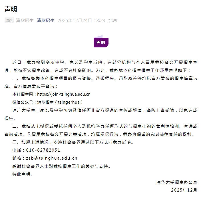 據(jù)“清華招生”微信公眾號消息,清華大學(xué)招生辦公室24日發(fā)布聲明稱,近日,清華大學(xué)招生辦公室接到多所中學(xué)、家長及學(xué)生反映,有部分機(jī)構(gòu)與個(gè)人冒用清華大學(xué)名義開展招生宣講,散布不實(shí)招生政策,造成不良社會(huì)影響。為此,清華大學(xué)招生辦公室就本科招生相關(guān)工作鄭重聲明如下:
