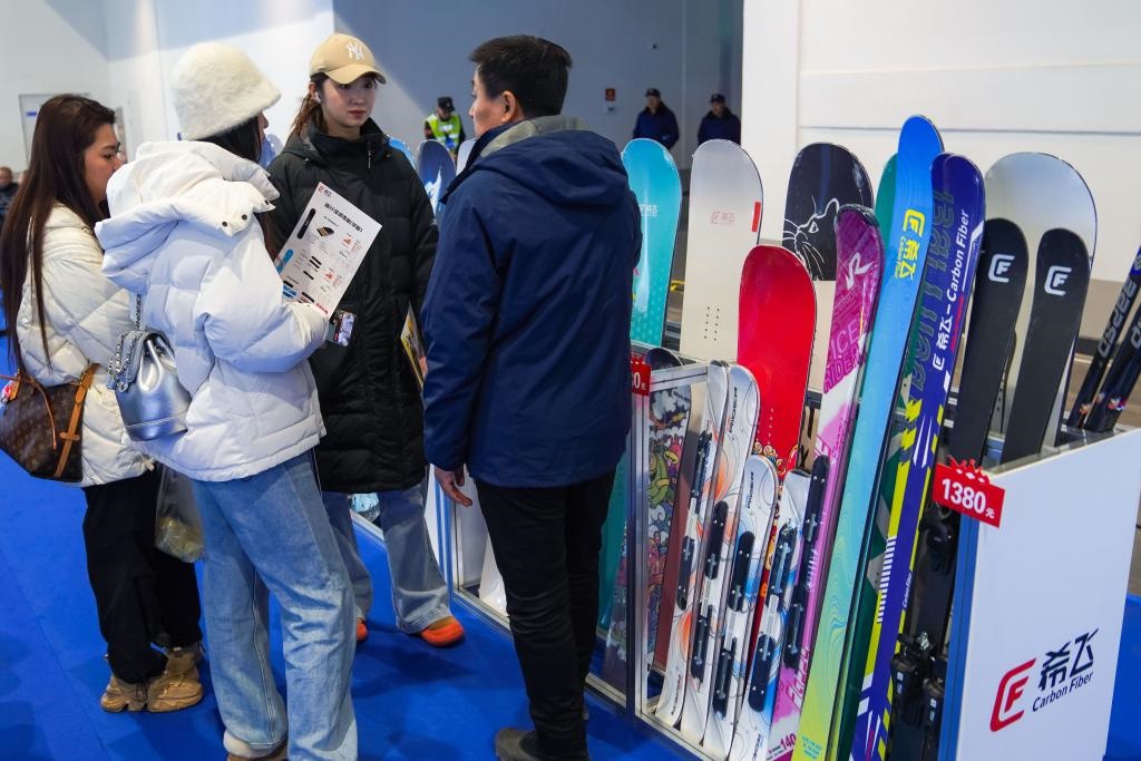 12月18日,參觀者在第九屆吉林冰雪產業(yè)國際博覽會現(xiàn)場參觀展出的國產碳纖維滑雪板。新華社記者 許暢 攝