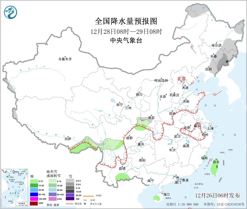 12月28日08時至29日08時,內蒙古東北部、東北地區(qū)北部和東部、西藏東南部、陜西南部、四川中部等地部分地區(qū)有小雪或雨夾雪,其中,吉林東部等地部分地區(qū)有中到大雪(5~7毫米)。西藏東南部、四川中部、云南南部、海南島中部、臺灣島等地部分地區(qū)有小雨,其中,臺灣島東部等地部分地區(qū)有中雨。內蒙古東部部分地區(qū)有4~6級風;南部海域有5~6級風,陣風7~8級。