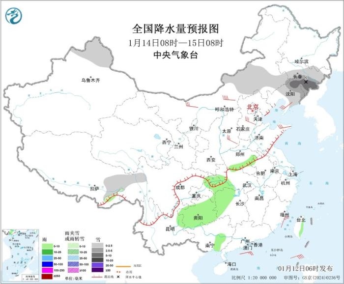 1月14日08時(shí)至15日08時(shí),新疆阿勒泰地區(qū)、內(nèi)蒙古中部、吉林大部、遼寧中北部、西藏東部等地部分地區(qū)有小雪或雨夾雪,其中,吉林中東部、遼寧北部等地部分地區(qū)有中到大雪(5~8毫米)。河南南部、湖北西南部、湖南西部、重慶東北部、貴州大部、云南東北部、廣西東南部、臺(tái)灣島東部等地部分地區(qū)有小雨。內(nèi)蒙古中部、山西南部、河北中部、遼東半島、山東半島等地部分地區(qū)有4~6級(jí)風(fēng)(見圖4);巴士海峽、南海東北部海域?qū)⒂?~7級(jí)、陣風(fēng)8級(jí)的偏東風(fēng)。