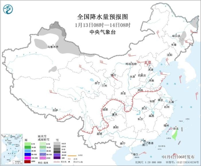 圖2 全國降水量預(yù)報(bào)圖(1月12日08時(shí)-13日08時(shí))。圖片來源:中央氣象臺(tái)網(wǎng)站