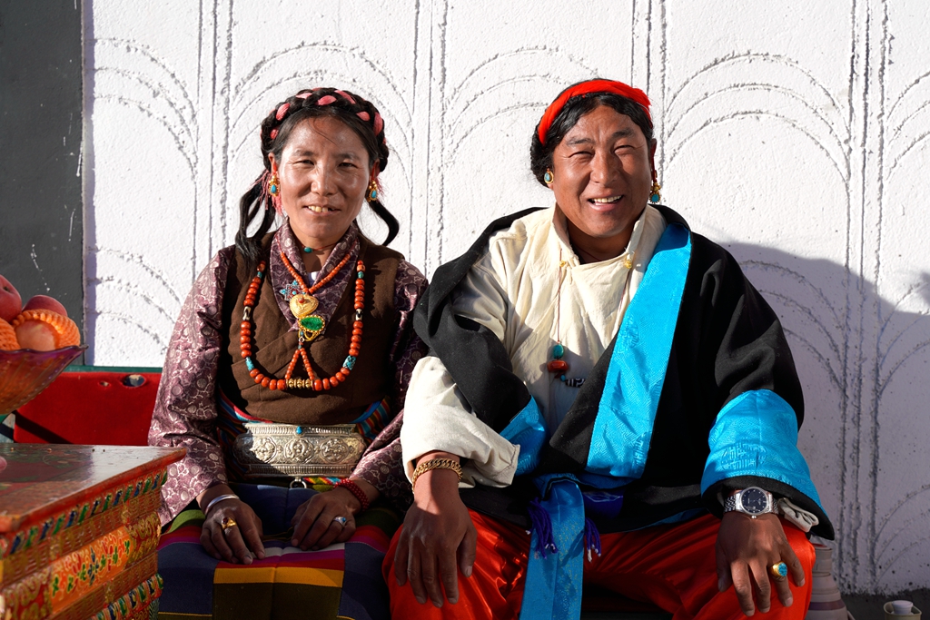 拍攝日,陽光清澈,天空湛藍(lán)。村民們穿上了最隆重的藏裝,女人發(fā)間的珊瑚與綠松石流淌著溫潤的光澤。許多老人被子女小心攙扶而來,他們的眼神里有局促,有陌生,也有隱約的期待。