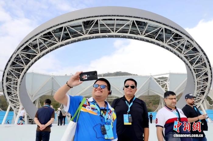 1月19日,第六屆亞洲沙灘運(yùn)動會世界媒體大會暨世界轉(zhuǎn)播商大會在海南三亞舉行。圖為國際記者參訪三亞天涯海角游覽區(qū)亞沙公園。(第六屆亞洲沙灘運(yùn)動會執(zhí)委會 供圖)