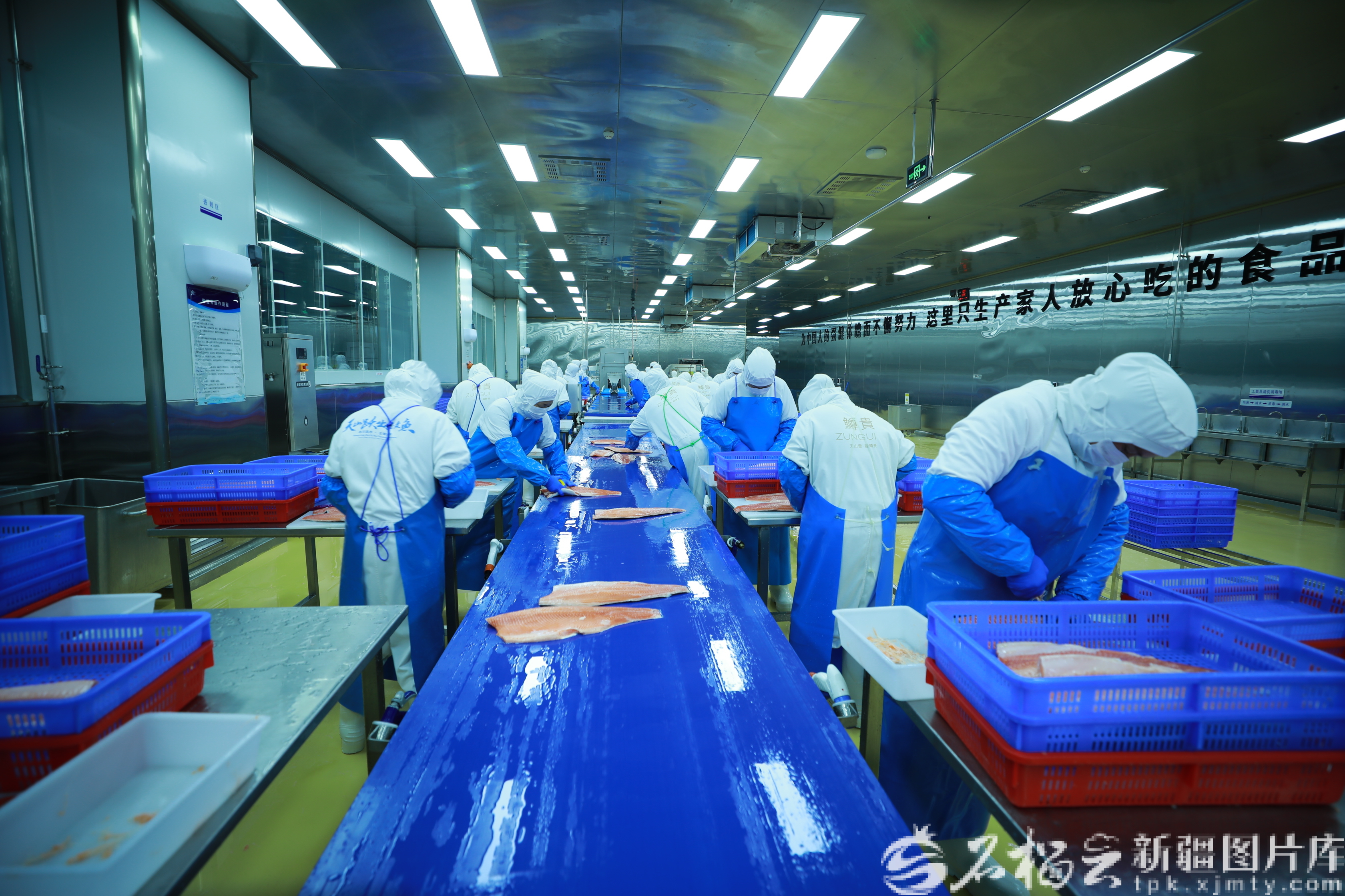新疆天蘊(yùn)有機(jī)農(nóng)業(yè)有限公司三文魚深加工廠,工人在加工三文魚。趙學(xué)林?jǐn)z(資料圖)