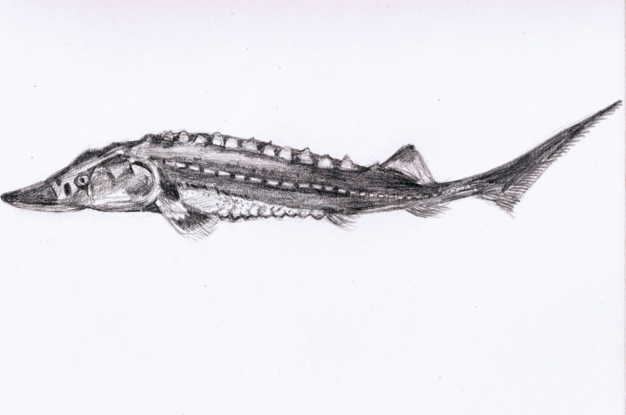 中華鱘生長較快,體型碩大,最大個(gè)體體長可達(dá)4米,體重可達(dá)680千克,最長壽命可達(dá)40齡以上 上海海洋大學(xué)學(xué)生手繪