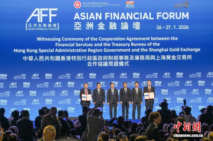 1月26日,在香港揭幕的第19屆亞洲金融論壇上,香港特區(qū)政府財(cái)經(jīng)事務(wù)及庫(kù)務(wù)局與上海黃金交易所簽署合作協(xié)議,推動(dòng)兩地黃金市場(chǎng)合作。圖為香港特區(qū)行政長(zhǎng)官李家超(左三)、中國(guó)人民銀行副行長(zhǎng)鄒瀾(右三)等嘉賓見(jiàn)證簽署合作協(xié)議。 中新社記者 陳永諾 攝
