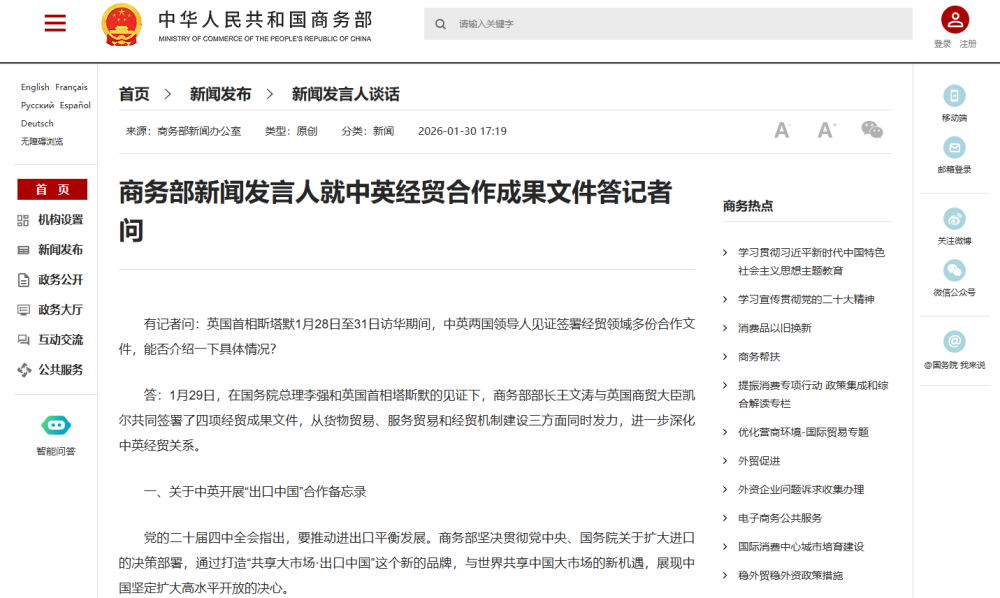 中國網(wǎng)1月30日訊 據(jù)商務(wù)部網(wǎng)站消息,商務(wù)部新聞發(fā)言人就中英經(jīng)貿(mào)合作成果文件答記者問。