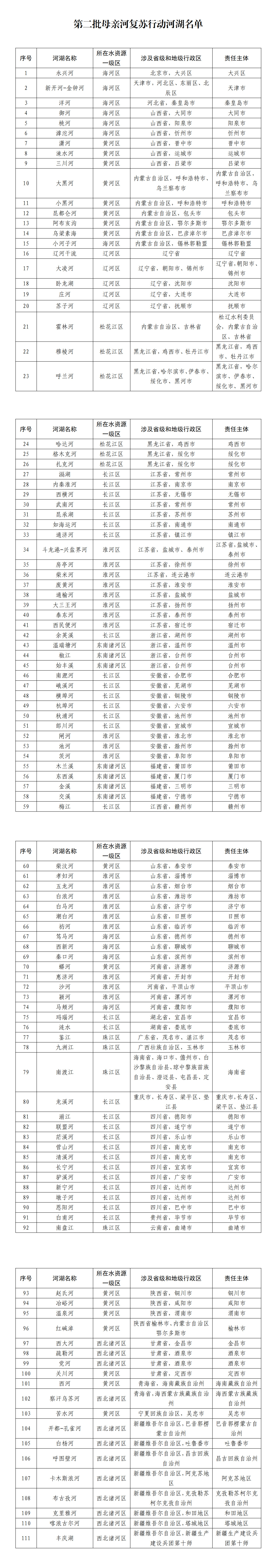 2022年以來,水利部圍繞解決河道斷流、湖泊萎縮干涸問題,在全國率先選取了88條(個)河(湖)開展母親河復蘇行動。為進一步擴大母親河復蘇行動范圍,水利部聚焦河道斷流、湖泊萎縮、水動力不足等問題,全面分析河湖水資源、水生態(tài)狀況,將復蘇需求迫切、具有復蘇可行性的111條(個)河(湖)納入第二批母親河復蘇行動,涉及29個省份和新疆生產(chǎn)建設(shè)兵團。