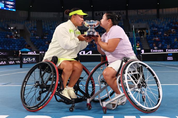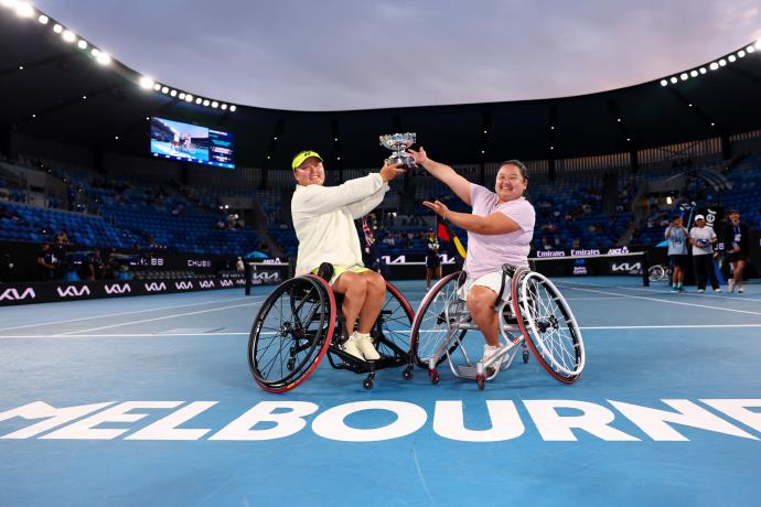 北京時(shí)間1月30日,2026澳網(wǎng)輪椅網(wǎng)球女雙決賽,頭號(hào)種子、中國(guó)組合王紫瑩/李曉輝以6-4、6-3擊敗2號(hào)種子朱珍珍/上地結(jié)衣,實(shí)現(xiàn)衛(wèi)冕。中國(guó)選手朱珍珍和搭檔上地結(jié)衣收獲亞軍。