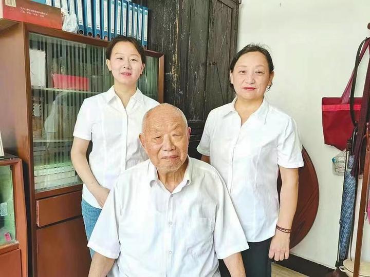 黃岡市級(jí)非遺代表性項(xiàng)目“紅色革命歌謠”的代表性傳承人梅仙桃(右)與父親梅基癸、女兒袁曉英合影。(麻城市委宣傳部供圖)