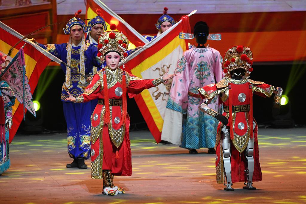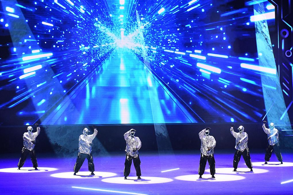 在開場節(jié)目《萬馬奔騰》中,20臺(tái)機(jī)械臂與26臺(tái)雙臂機(jī)器人齊揮鼓槌,激昂鼓聲奏出奮進(jìn)節(jié)拍。