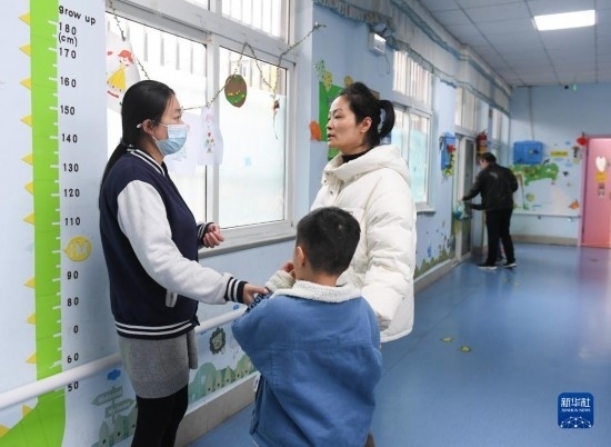 3月29日,一名老師帶著自閉癥兒童進(jìn)教室上課。