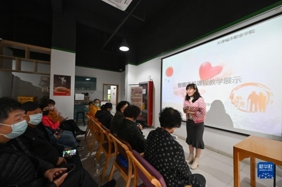 4月4日,在天津市河西區(qū)下瓦房街道居家養(yǎng)老服務(wù)中心,授課教師為老人們提供智能手機應(yīng)用教學服務(wù)。