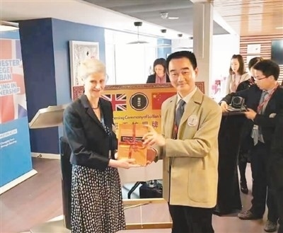 呂景泉(前右)向合作開設(shè)英國魯班工坊的英方學(xué)校代表贈(zèng)送中方研發(fā)出版的教材。