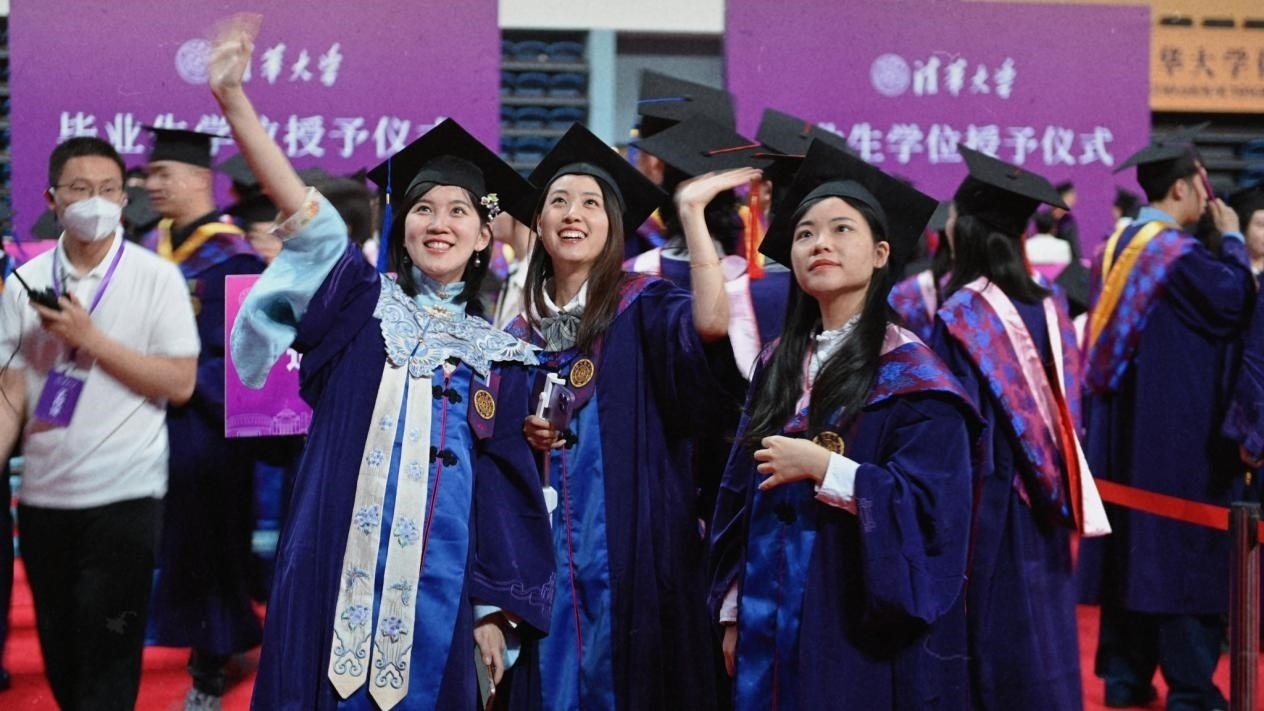 畢業(yè)生向看臺(tái)揮手。清華大學(xué)供圖