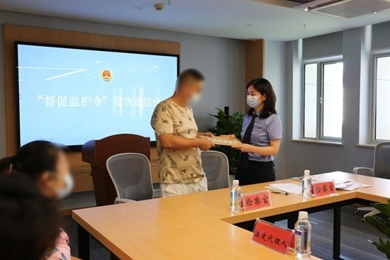 檢察官對(duì)失職家長(zhǎng)送達(dá)督促監(jiān)護(hù)令。程珊/攝