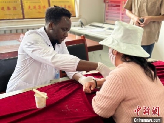 圖為贊比亞留學(xué)生為紅崖溝村村民診療。劉洋 攝