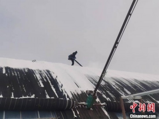 圖為在溫室大棚屋頂上除雪的許良鶴。許良鶴供圖