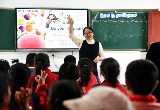 2023年4月13日,在貴州省黔西市鐵石苗族彝族鄉(xiāng)鐵石小學(xué),來自廣州市增城區(qū)中新鎮(zhèn)第二小學(xué)的老師在上英語公開課。通訊員 熊軍萬 攝