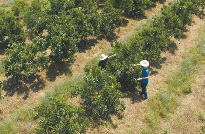 | 曹立新(右)在柑橘基地里給農(nóng)民做技術(shù)指導。鄭家裕攝 |