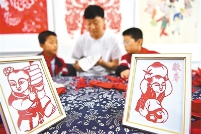 山東高密姜莊鎮(zhèn)產學研實踐基地內,非遺傳承人指導小朋友剪紙。李海濤攝(人民圖片)