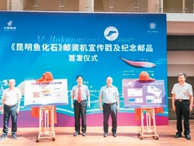 2023年5月,《昆明魚化石》郵資機(jī)宣傳戳及系列紀(jì)念郵品在西北大學(xué)博物館首發(fā)。此次啟用的《昆明魚化石》郵資機(jī)宣傳戳,是以中國科學(xué)院院士、西北大學(xué)教授舒德干團(tuán)隊發(fā)現(xiàn)的鳳姣昆明魚化石為原型設(shè)計制作。鳳姣昆明魚距今已5.18億年,是已知最古老的脊椎動物。該魚的發(fā)現(xiàn),為揭示寒武紀(jì)大爆發(fā)奧秘、破解遠(yuǎn)古生命演化謎團(tuán)提供了獨(dú)特的劃時代里程碑證據(jù)。圖為首發(fā)儀式現(xiàn)場。中新社發(fā)