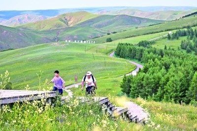 家長與孩子在內(nèi)蒙古大青山國家級自然保護區(qū)徒步。新華社發(fā)