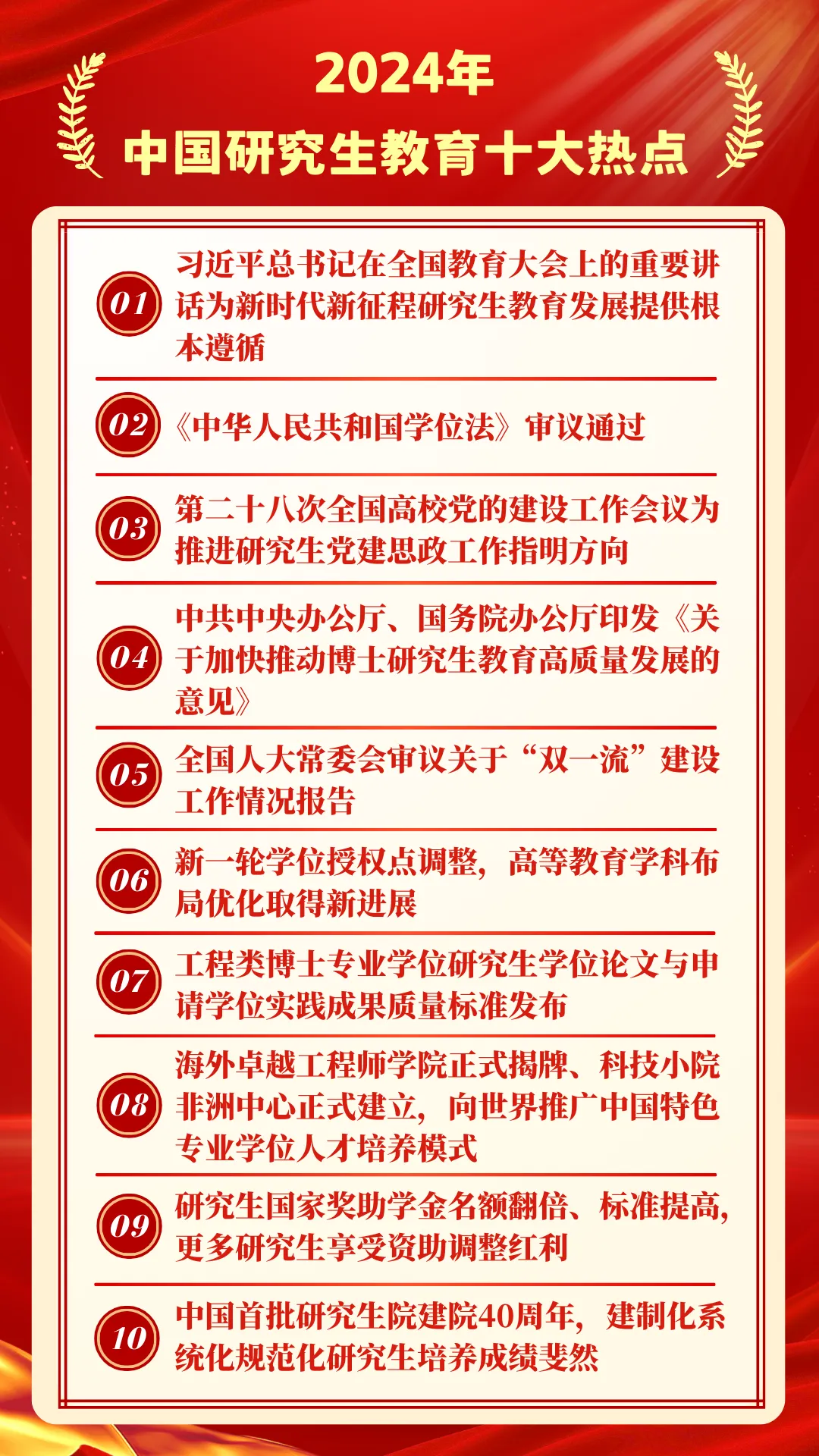 2024年,是中國學位與研究生教育發(fā)展史上具有重要里程碑意義的一年,在教育部學位管理與研究生教育司指導下,教育部學位與研究生教育發(fā)展中心《中國研究生》雜志回顧總結(jié)全年研究生教育大事要事和熱點動態(tài),聯(lián)合人民網(wǎng)、新華網(wǎng)、中國教育報和有關研究生教育媒體等共同發(fā)布2024年中國研究生教育十大熱點。