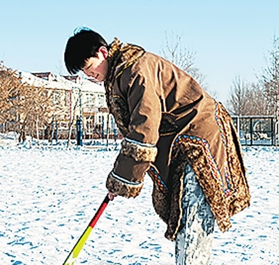 寒假期間,每當(dāng)夕陽的余暉染紅了大地,達(dá)斡爾族人迎新春最傳統(tǒng)的運動項目——打火球就要拉開序幕。打火球的比賽規(guī)則簡單而有趣,通常選擇平坦的草地或村中開闊的街道作為場地,兩端各設(shè)一個球門,兩隊人數(shù)相等即可,以進(jìn)球多者為勝。盡管開始時我屢屢失誤,但在長輩們的鼓勵和指導(dǎo)下,我逐漸掌握了技巧,每一次成功擊打都讓我興奮不已。