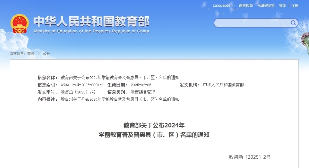 近日,教育部印發(fā)通知,通過縣級自評、市級初核、省級評估、國家認(rèn)定的程序,2024年認(rèn)定天津市濱海新區(qū)等301個縣(市、區(qū))為學(xué)前教育普及普惠縣。其中,浙江省湖州市、衢州市,山東省青島市、東營市,福建省廈門市,新疆維吾爾自治區(qū)博爾塔拉蒙古自治州等6個市(州)已全域通過國家評估認(rèn)定。