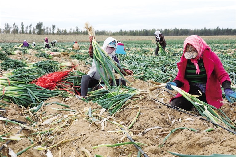 正在忙著收蔥打捆的村民于新穎說:“看這蔥長得多好!”