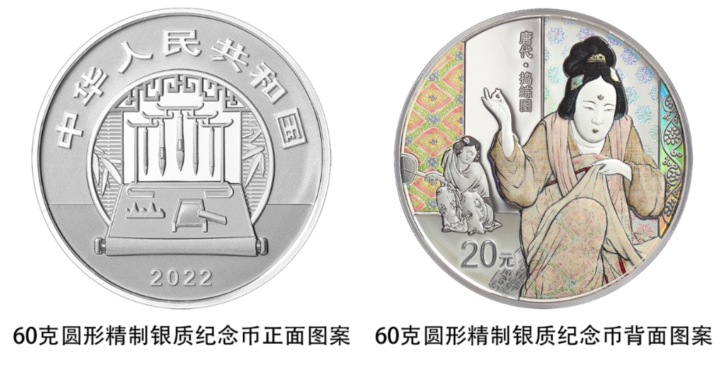一枚60克圓形銀質(zhì)紀念幣背面圖案為《搗練圖》中縫紉、煽火造型,襯以裝飾紋樣組合設(shè)計,并刊“唐代·搗練圖”字樣及面額。