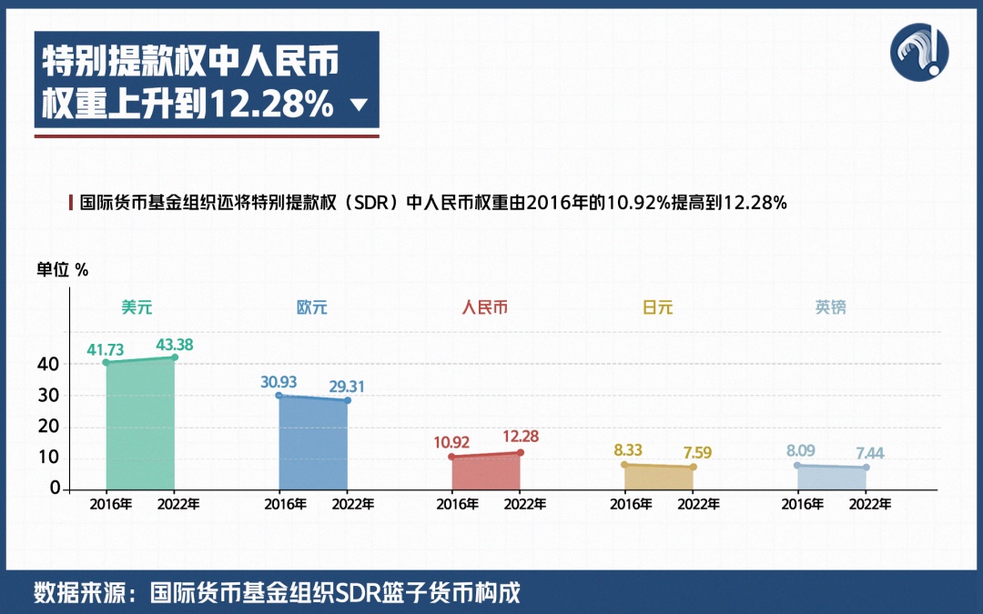 近日,國際貨幣基金組織還將特別提款權(quán)(SDR)中人民幣權(quán)重由2016年的10.92%提高到12.28%。