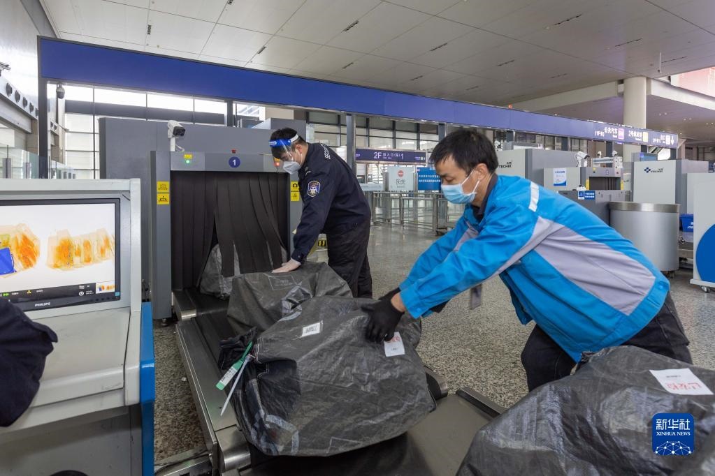 11月1日,在上海虹橋站內(nèi)貨物專用安檢口,鐵路工作人員搬運通過安檢的貨物。新華社記者 王翔 攝