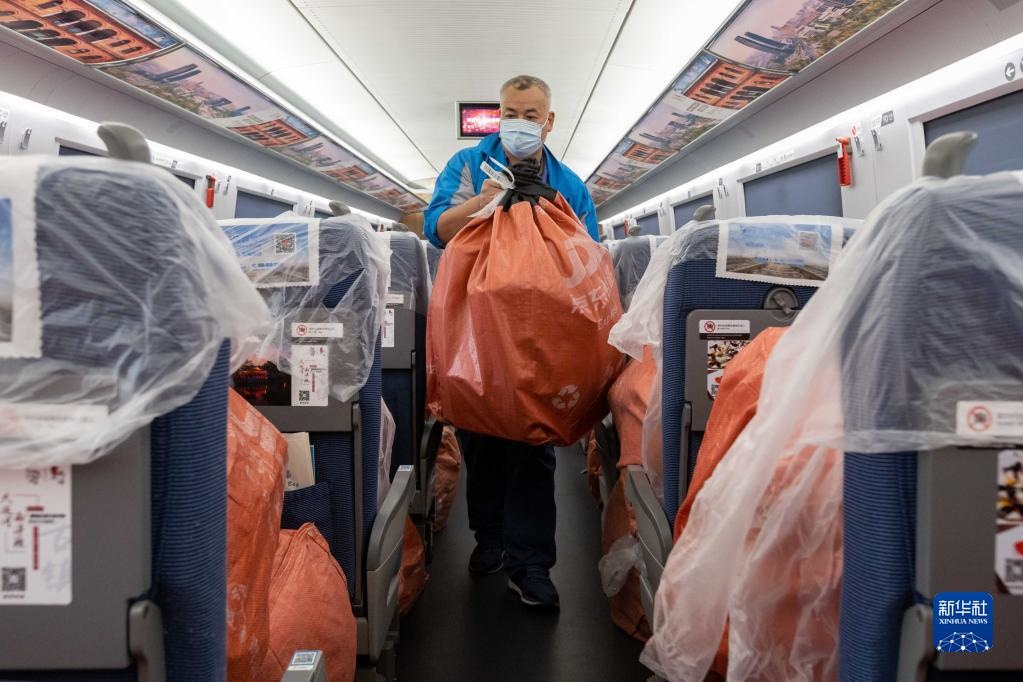 11月1日,在G1373次列車上,鐵路工作人員搬運貨物。新華社記者 王翔 攝