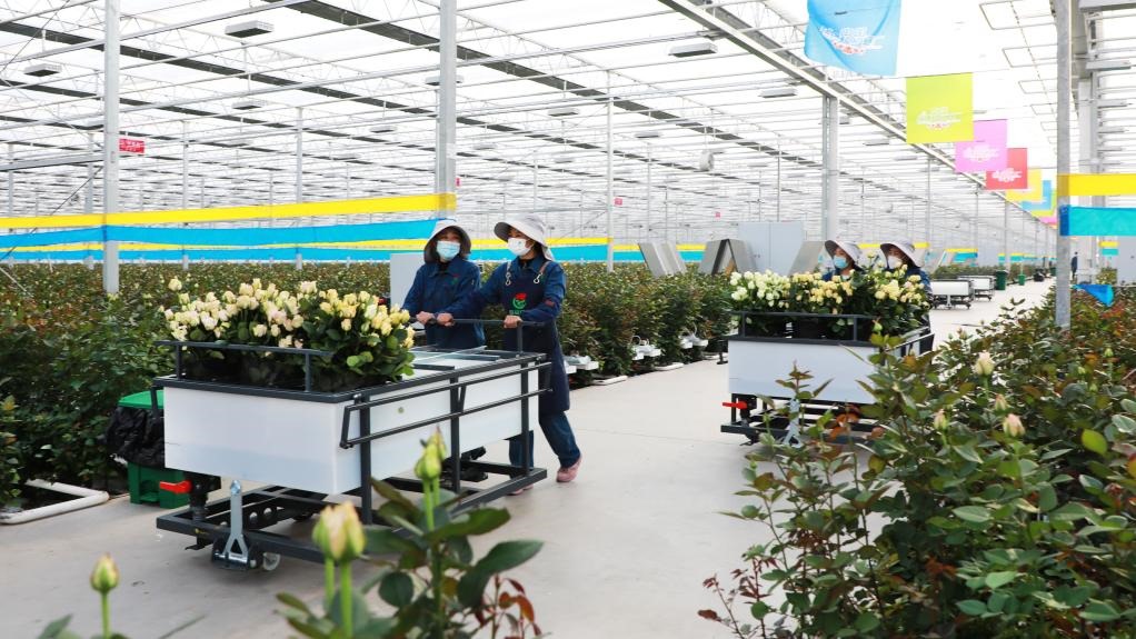 在位于甘肅省臨夏市的百益億農(nóng)國(guó)際鮮花港,工人們正在搬運(yùn)剛剛采摘的玫瑰。(受訪(fǎng)單位供圖)