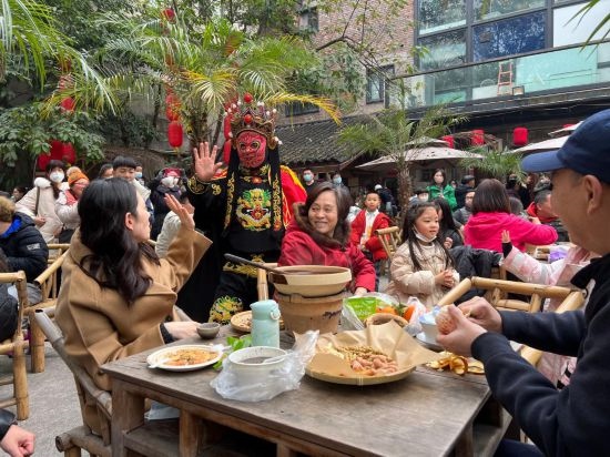 春節(jié)期間,重慶市渝中區(qū)山城巷中,“山城壩壩”茶館的院壩內(nèi)坐滿了客人。人們一邊圍爐煮茶,一邊欣賞臺上的傳統(tǒng)藝術表演,川劇變臉演員剎那間切換臉譜,贏得滿堂喝彩。老板舒蓉熱情招呼著客人,將茶水、點心端到桌上,忙得不亦樂乎。“今年春節(jié)的客流量遠超預期,營業(yè)額是去年同期的七八倍。”