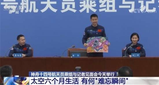 記者會上,航天員陳冬收到了來自家鄉(xiāng)特殊教育學(xué)校孩子的一幅畫作。