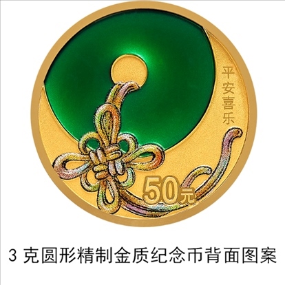 3克圓形金質(zhì)“平安喜樂”紀念幣背面圖案為平安扣、中國結(jié)裝飾組合圖案,并刊“平安喜樂”字樣及面額。
