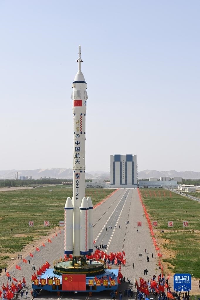 5月22日,神舟十六號載人飛船與長征二號F遙十六運載火箭組合體在轉(zhuǎn)運途中。新華社發(fā)(汪江波 攝)
