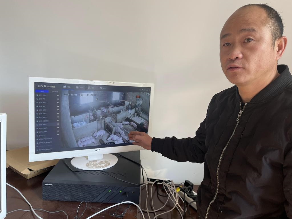 圖為2023年2月1日拍攝的何西康通過線上視頻監(jiān)控平臺查看豬崽生長情況。新華社記者 李驚亞 攝