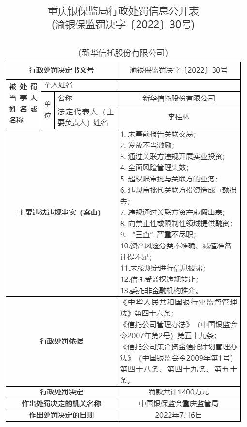 2022年下半年,重慶銀保監(jiān)局曾對(duì)新華信托開出二十余張“罰單”。