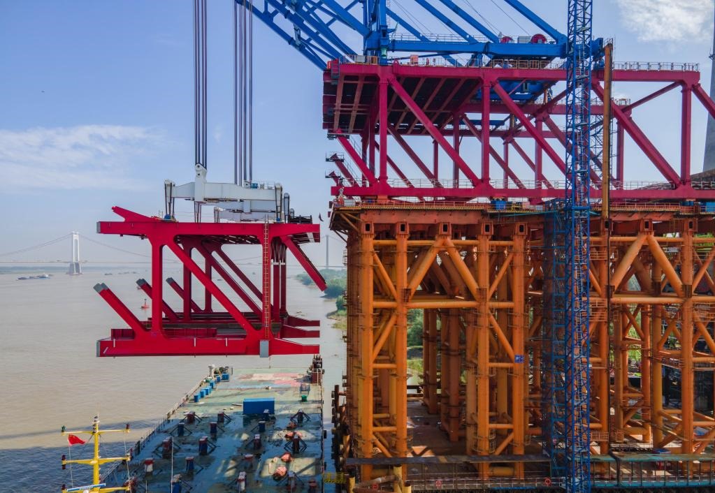 安徽省馬鞍山公鐵兩用長江大橋施工現(xiàn)場,30多名工人在百米高空進行塔柱混凝土澆筑工作。在他們的操作下,混凝土沿著分料槽澆筑到模板當(dāng)中。