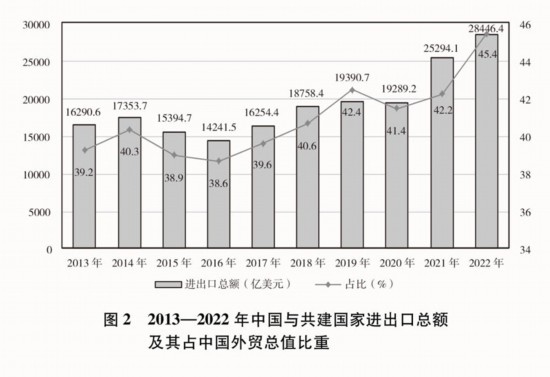 貿(mào)易投資規(guī)模穩(wěn)步擴大。2013-2022年,中國與共建國家進出口總額累計19.1萬億美元,年均增長6.4%;與共建國家雙向投資累計超過3800億美元,其中中國對外直接投資超過2400億美元;中國在共建國家承包工程新簽合同額、完成營業(yè)額累計分別達到2萬億美元、1.3萬億美元。2022年,中國與共建國家進出口總額近2.9萬億美元,占同期中國外貿(mào)總值的45.4%,較2013年提高了6.2個百分點;中國民營企業(yè)對共建國家進出口總額超過1.5萬億美元,占同期中國與共建國家進出口總額的53.7%。