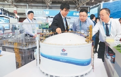 11月29日,在北京舉行的首屆中國國際供應鏈促進博覽會上,參觀者了解中海石油獨創(chuàng)的擁有自主知識產(chǎn)權(quán)的全容式液化天然氣(LNG)儲罐。陳曉根攝(人民視覺)