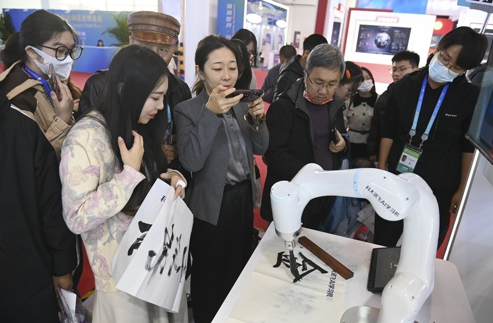 參觀者在首屆中國國際供應(yīng)鏈促進(jìn)博覽會(huì)數(shù)字科技鏈展區(qū)科大訊飛展位觀看一款A(yù)I書法機(jī)器人寫毛筆字(2023年12月2日攝)。新華社記者 蔡湘鑫 攝