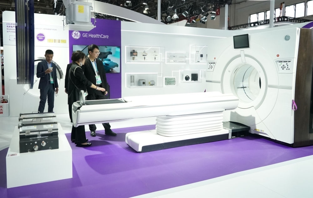 這是在首屆中國國際供應(yīng)鏈促進(jìn)博覽會(huì)健康生活鏈展區(qū)拍攝的GE醫(yī)療展位(2023年11月29日攝)。新華社記者 任超 攝
